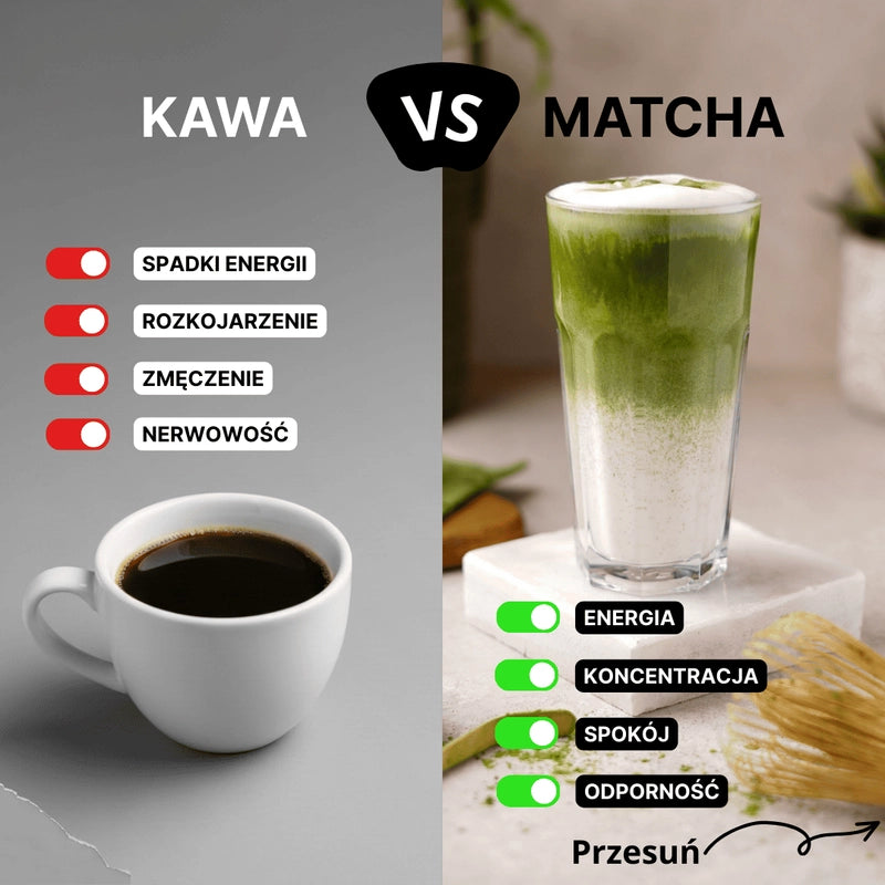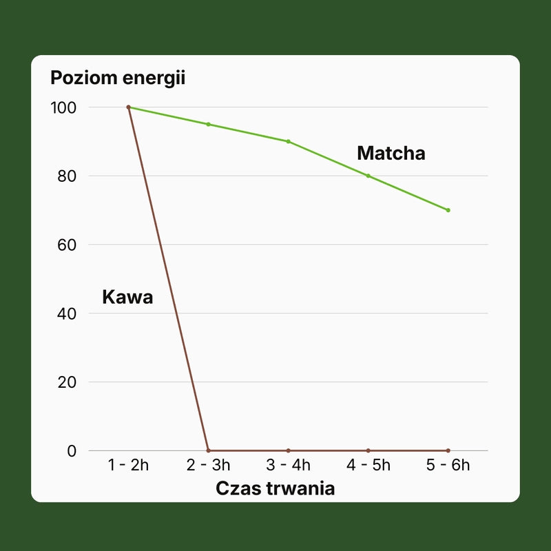 Matcha zawiera naturalną kofeinę połączoną z L-teaniną, co zapewnia bardziej stabilne i długotrwałe pobudzenie niż kawa. Bez nerwowości, kołatania serca i nagłych spadków energii.